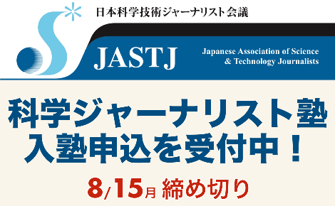 日本科学技術ジャーナリスト会議(JASTJ)では、情報を伝えるために必要な「企画力」「取材力」「構成力」「表現力」をプロから学ぶ「科学ジャーナリスト塾」を9月から開講します。著名なジャーナリストやプロデューサーたちが、長年の活動で身に着けた極意をあなたに伝授します。