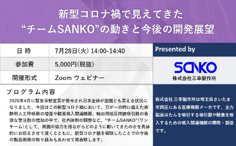 今回はこの新型コロナ禍において、万が一の時に備えた麻酔用人工呼吸器の増産や酸素吸入関連機器、輸出用低圧持続吸引器の急激な受注数の増加の中で、社内体制の調整など、“チームSANKO”(ワンチーム)として、周囲の協力を得ながらどのように動いてきたのかを具体的にお伝えさせて頂くとともに、新型コロナ禍を経験したことでの今後の製品開発の取り組みもあわせて発表致します。